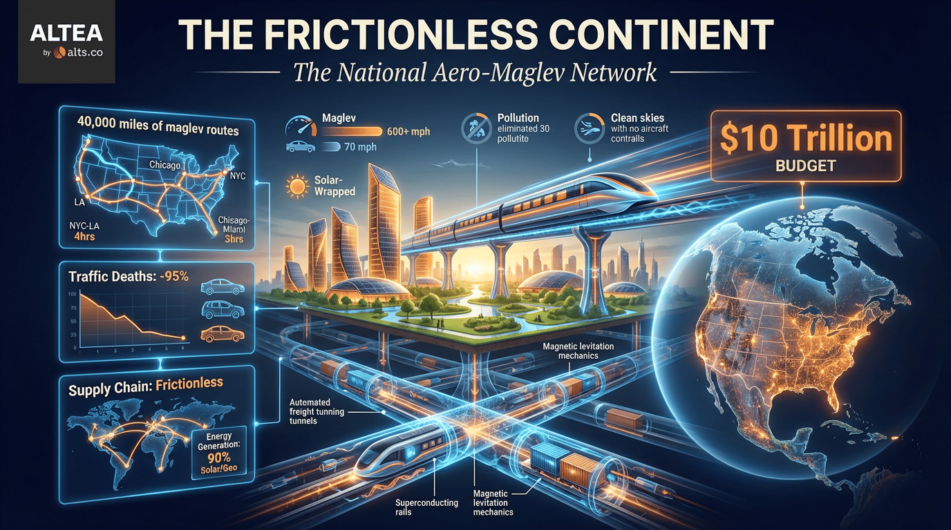 Superconducting Maglevs: A 40,000-mile network of vacuum-tube trains (Hyperloop-style) connecting every major US city at speeds of 600+ mph. NYC to LA in 4 hours.