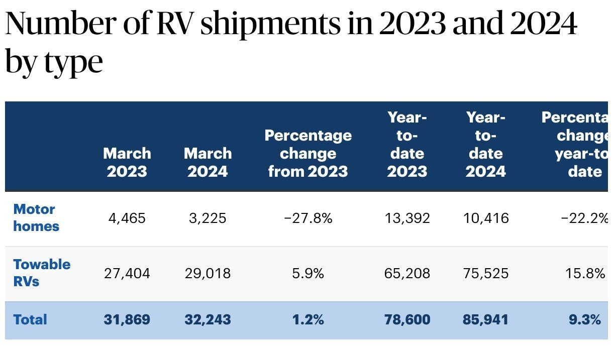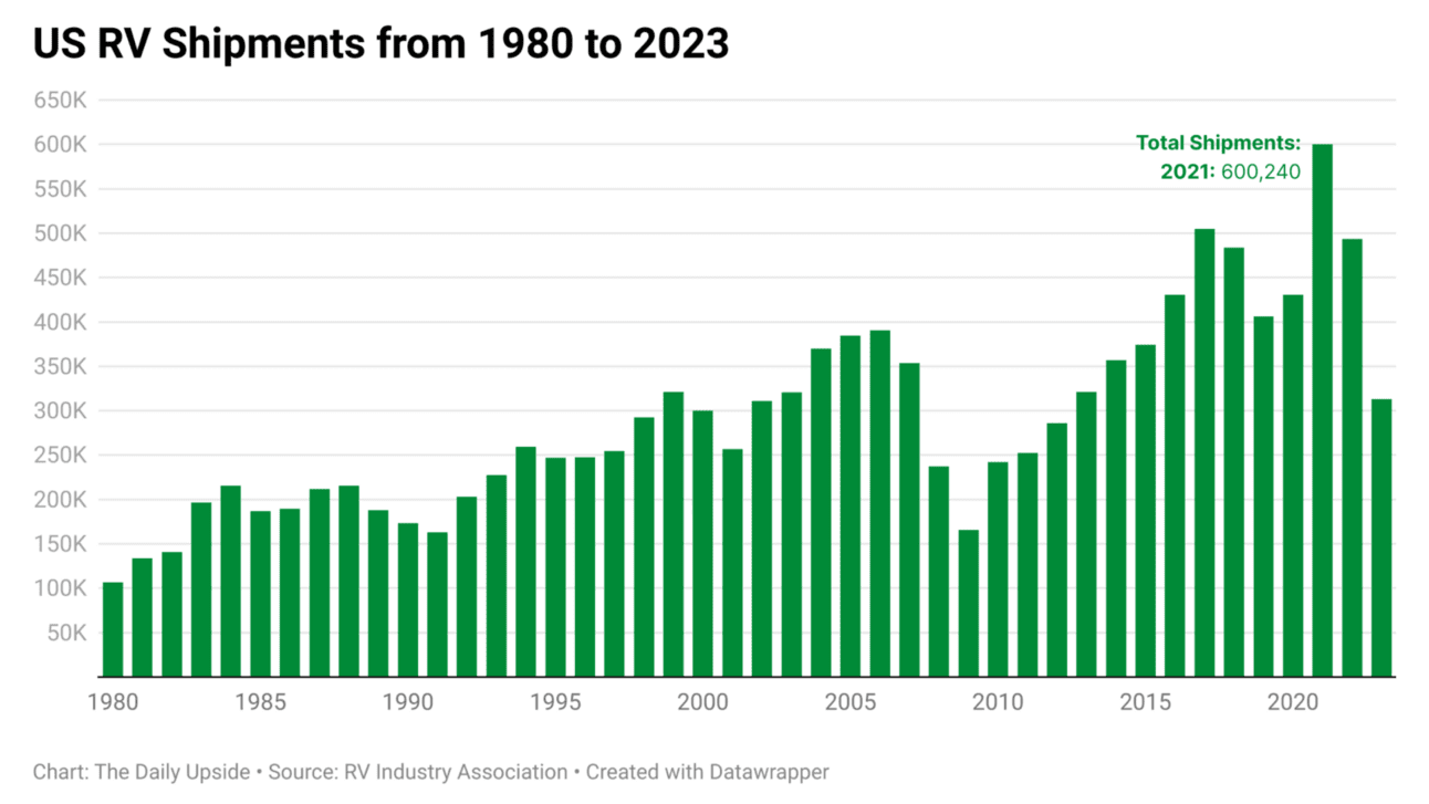 RVs are like a "mood ring" for the US economy. You can tell how the US is doing by how many people are willing to shell out $100k+ for what’s essentially a small, inconvenient apartment on wheels.
