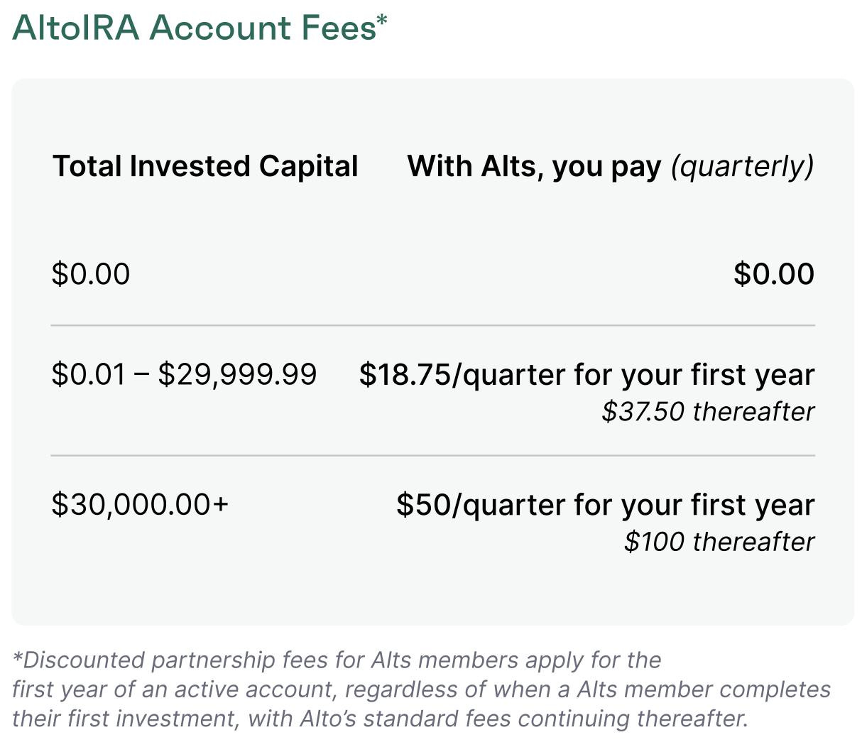 Alto IRA accounts are charged a simple quarterly Account Fee based on Total Invested Capital.